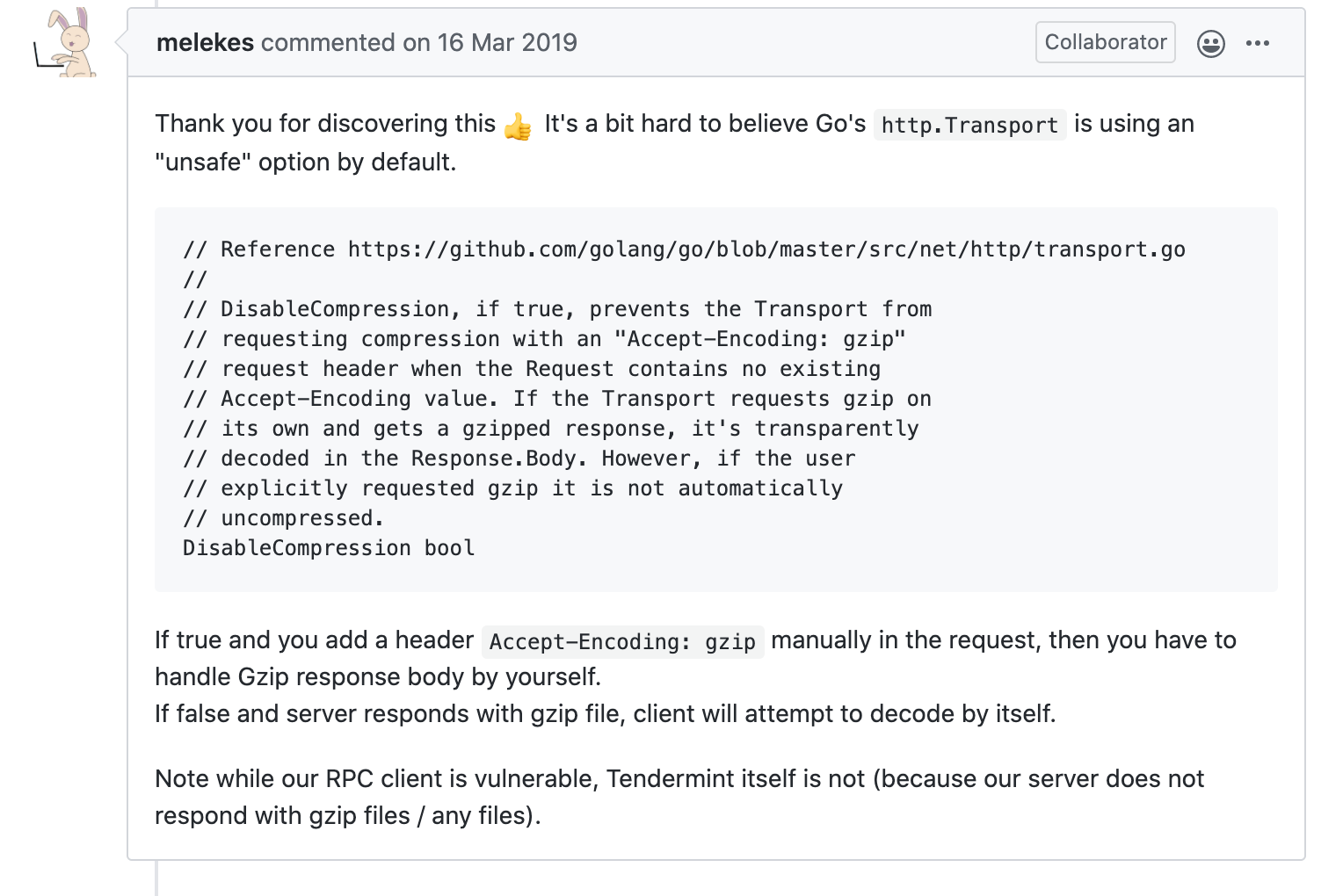 tendermint在v0.31.1版本的http_client.go新增了以下代码来显示地禁用对gzip响应的解压