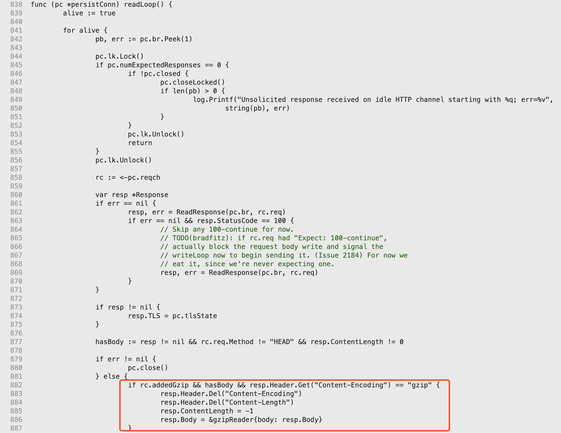 通过源码可以发现Go客户端对响应的gzip压缩数据的解压处理是在/src/net/http/transport.go中的persistConn对象的readLoop方法中实现的