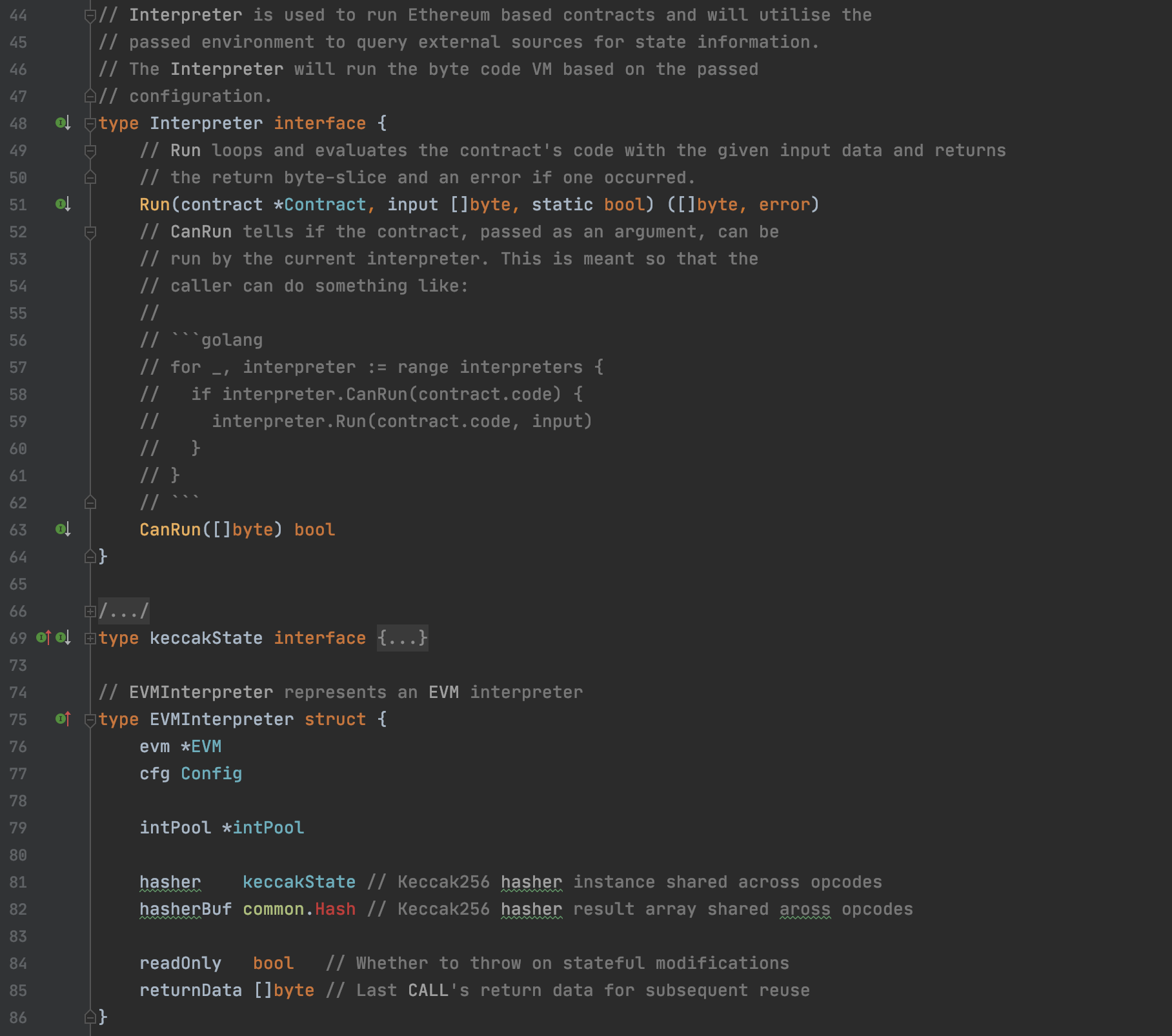 解释器相关代码在interpreter.go中,interpreter是一个接口,目前仅有EVMInterpreter这一个具体实现