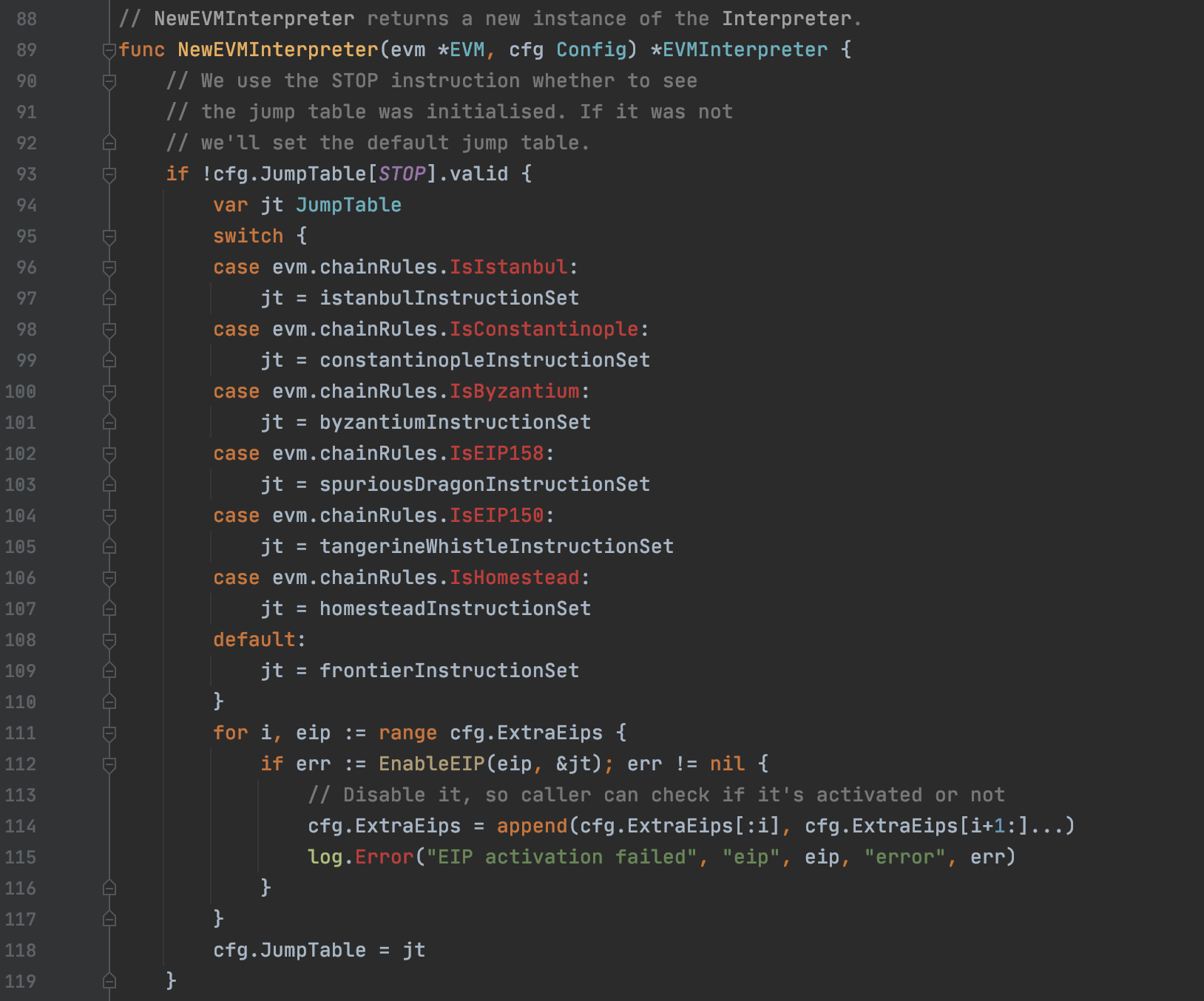 在interpreter.go创建解释器的NewEVMInterpreter函数中,会根据以太坊版本选择相应的指令集