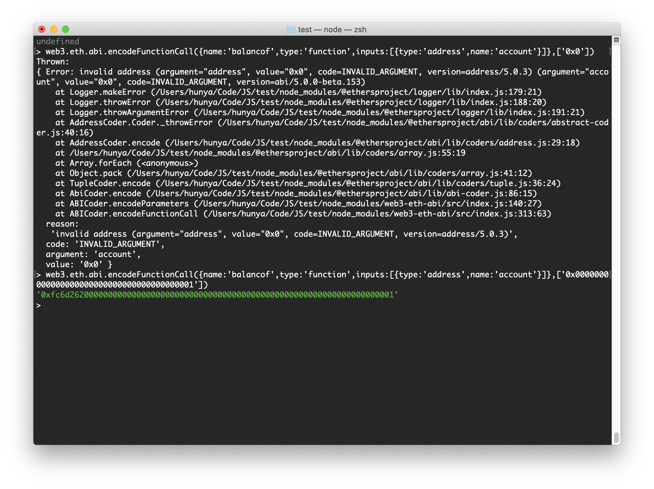 很明显,getAddress函数中会先对地址的形式做校验,正则中的{40}必须匹配到40位长度,匹配之后还会计算校验和,否则就会在上层encode中的try...catch语句中抛出错误Error: invalid address