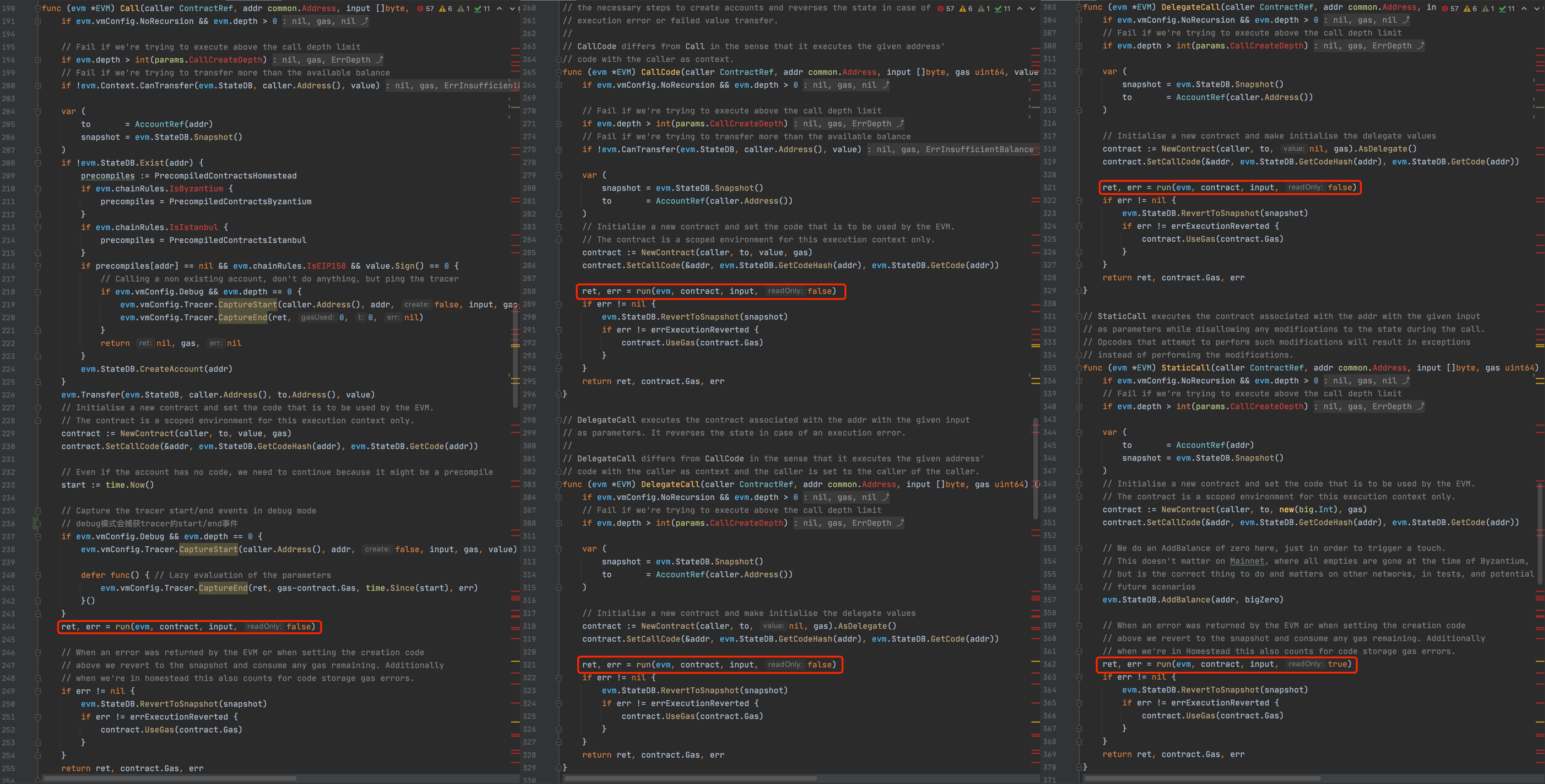 EVM的源码位于go-ethereum/core/vm/目录下,在evm.go中定义了EVM结构体,并实现了EVM.Call、EVM.CallCode、EVM.DelegateCall、EVM.StaticCall四种方法来调用智能合约,EVM.Call实现了基本的合约调用的功能,后面三种方法与EVM.Call略有区别,但最终都调用run函数来解析执行智能合约