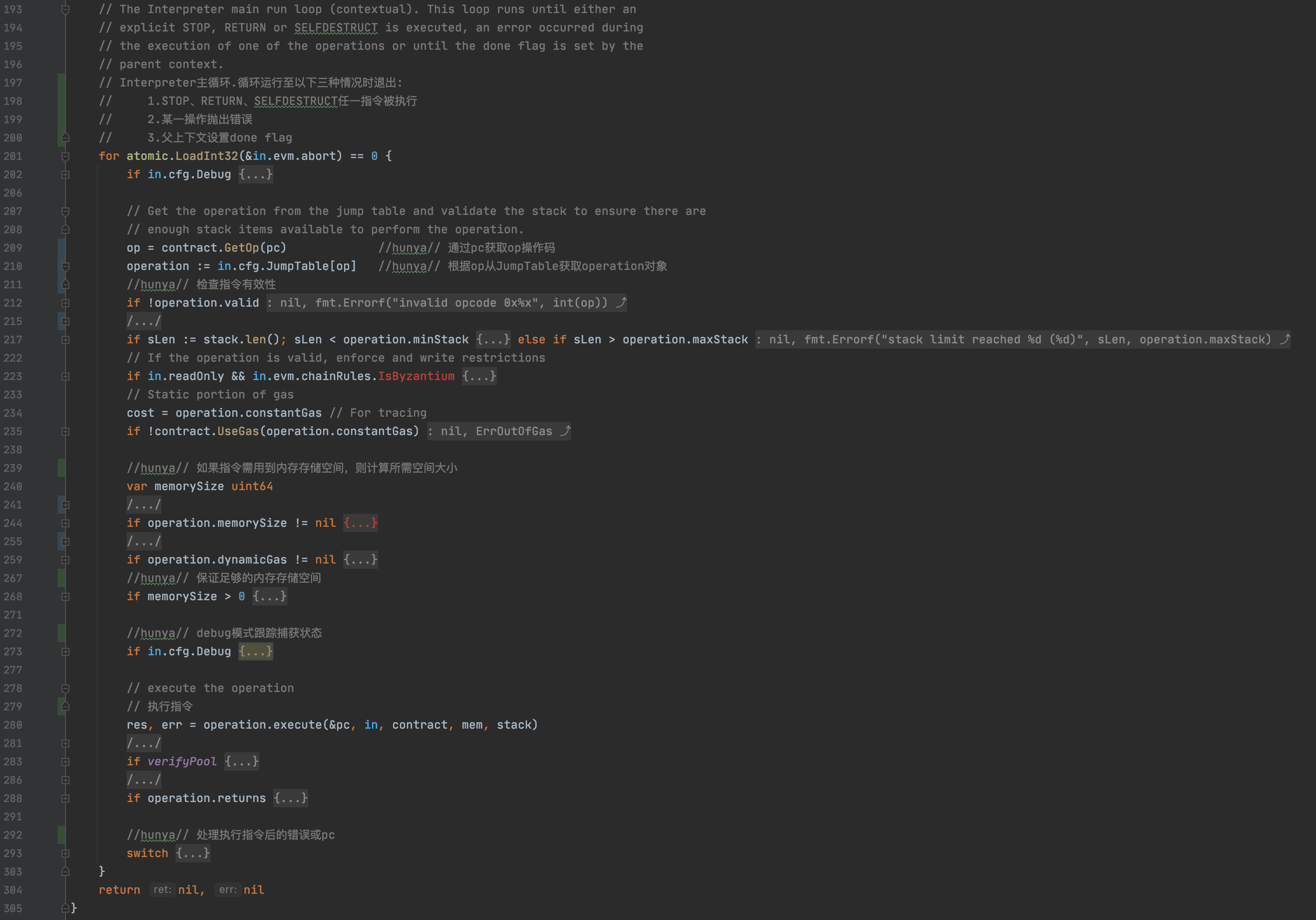 EVMInterpreter.Run方法中处理执行合约字节码的主循环如下: