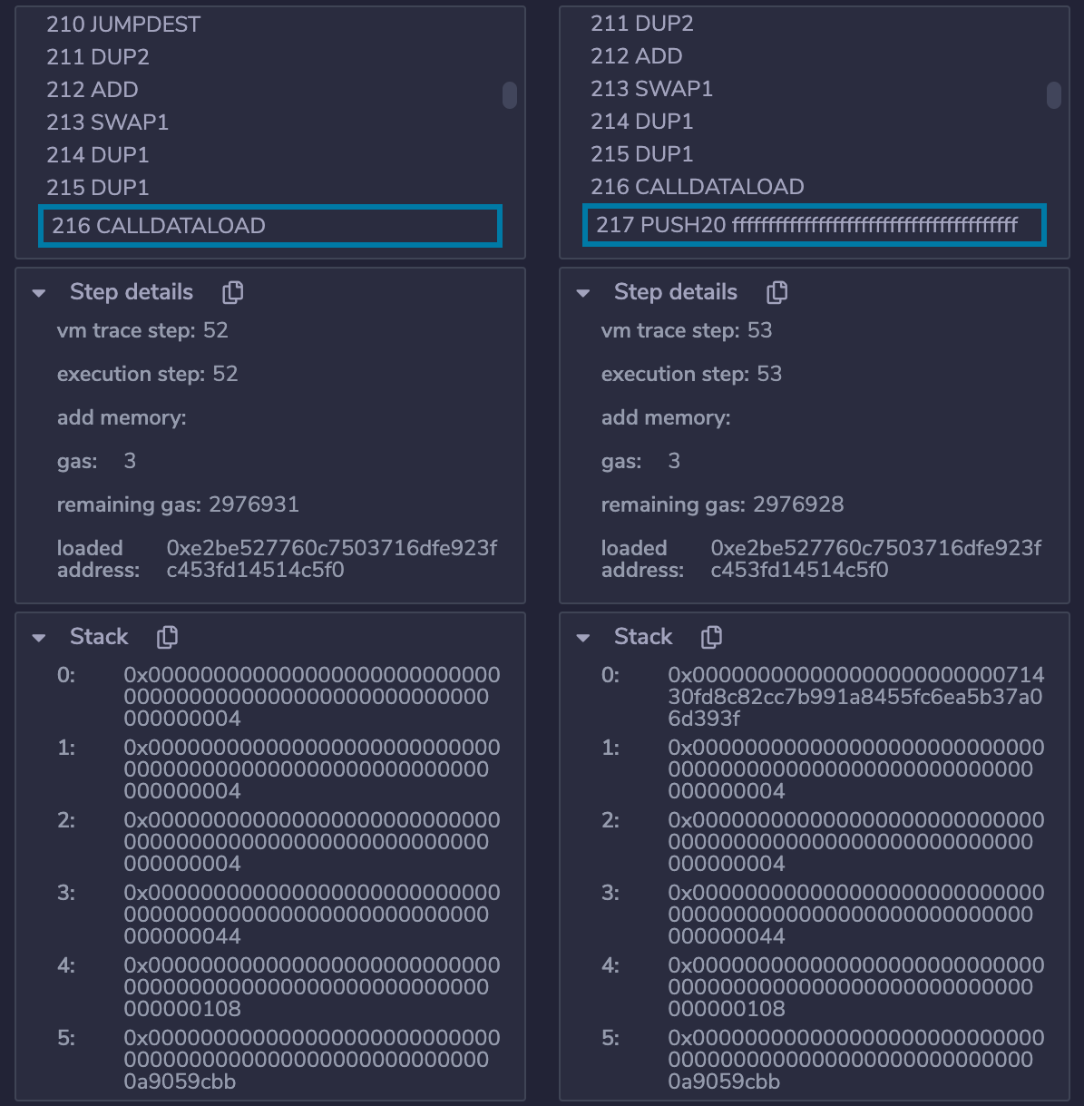 我们重点关注opCallDataLoad函数是如何处理input中的参数入栈的