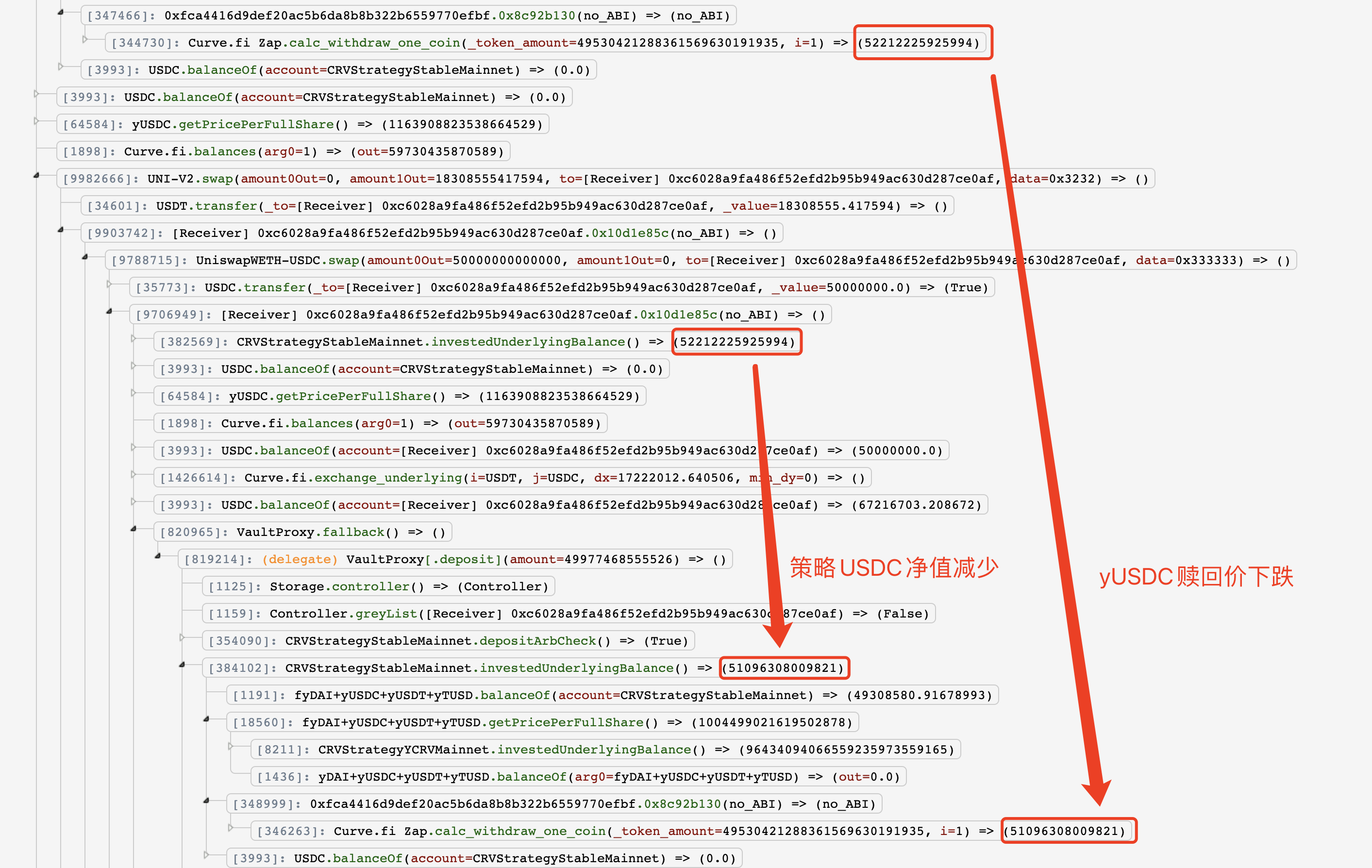 而当前面巨额兑换USDC后,y池中 USDC 价格上涨,那么相对价格 USDC/yUSDC 就会下跌。Harvest.finance的 USDC 策略中 yUSDC 资产所具有的 USDC 净值经calc_withdraw_one_coin计算而来就损耗减少,最终反映到deposit函数的 fUSDC 铸造算法中,将导致 fUSDC 铸造量增加