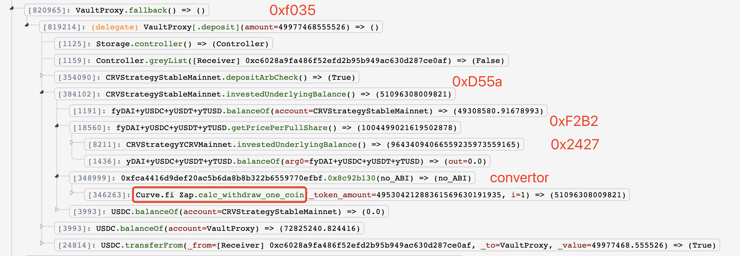 攻击合约未开源,暂时不作分析。可先从关键的VaultProxy fUSDC池合约0xf035deposit函数入手,分析fUSDC的铸造量是如何计算的