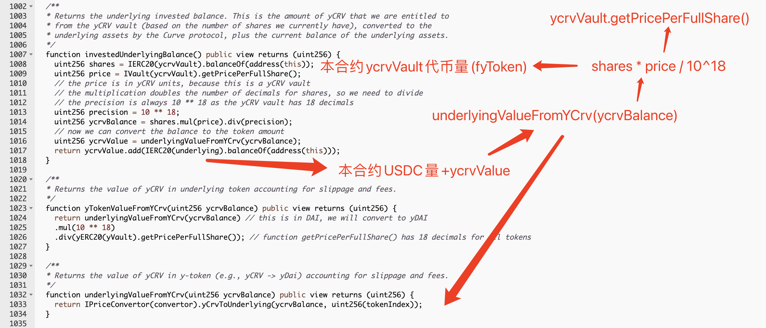 可以明显看出price即是yToken对fyToken的占比,那么sharesprice的乘积即代表策略合约所占有的 yToken 量,最后传入underlyingValueFromYCrv函数,在该函数中会调用convertor.yCrvToUnderlying