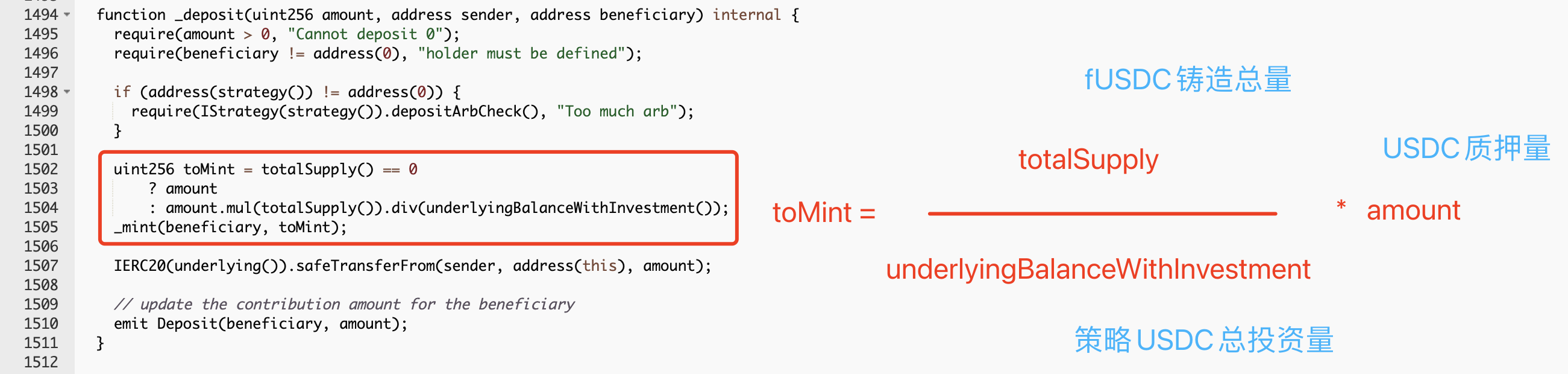 从质押函数中可以看出fUSDC的铸造量是根据fUSDC总量和USDC策略的总投资量的比例来决定的