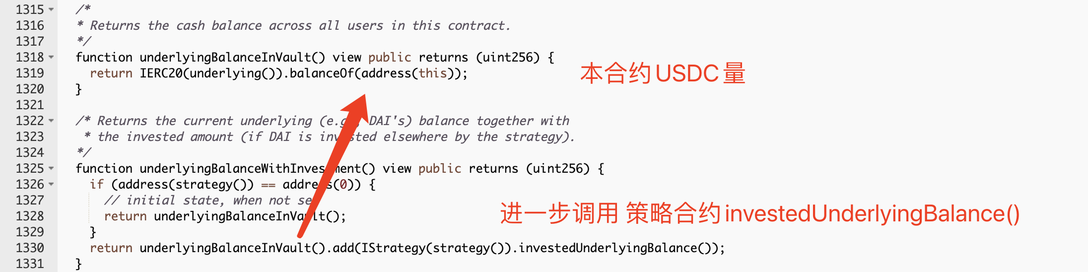 来到稳定币策略合约0xD55ainvestedUnderlyingBalance函数实现如下: