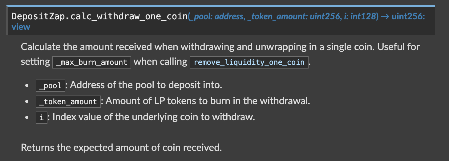 可以看到前面的调用流程分析如实,并且 convetor 的调用最终会调用 Curve 的Zap.calc_withdraw_one_coin,而该函数用于查询 lpToken 的赎回价